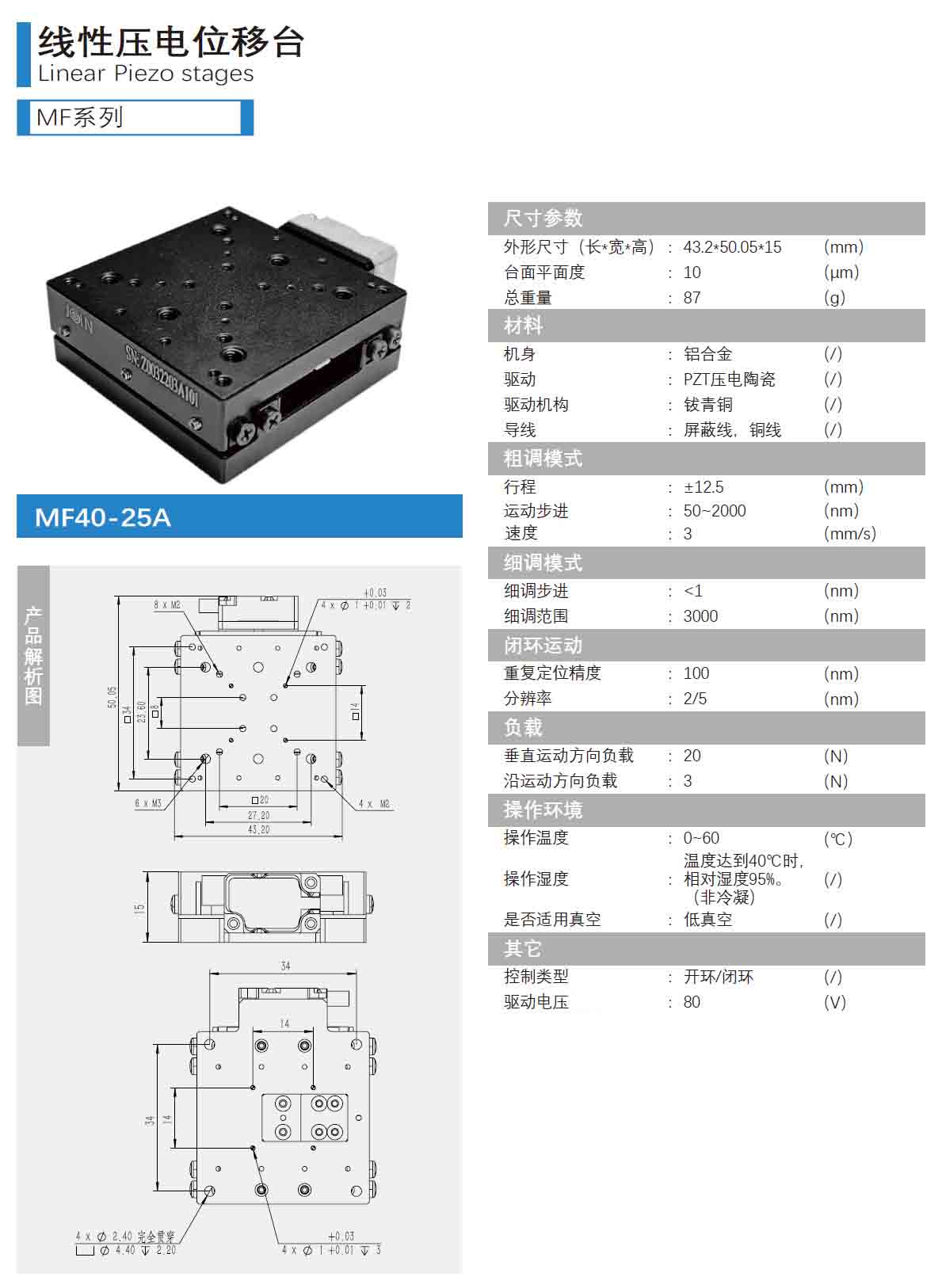 线性压电位移台MF40-25A机身采用铝合金材质,细调范围3000nm,适用于低真空环境使用。