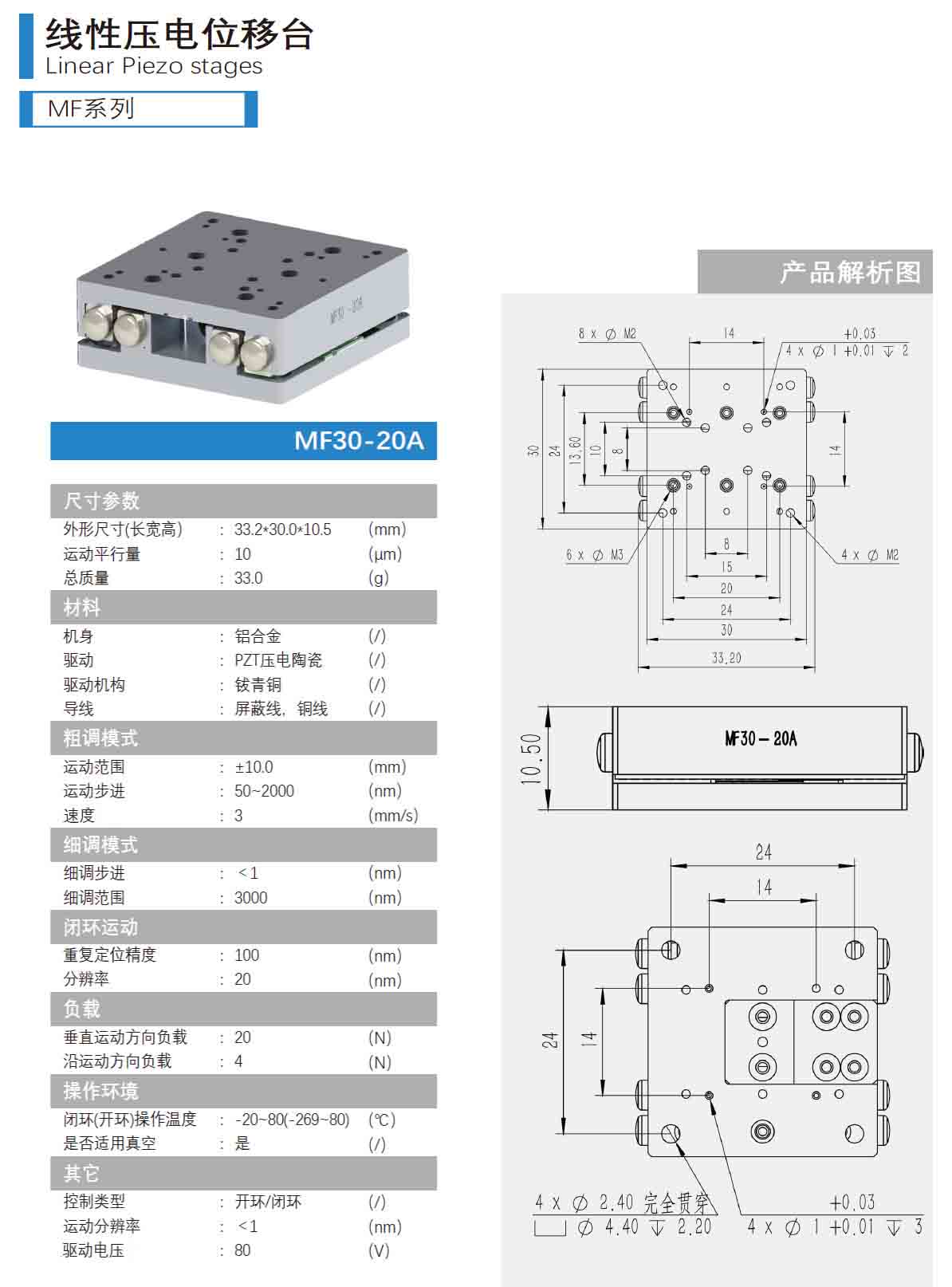 线性压电位移台-MF系列 MF30-20A技术参数