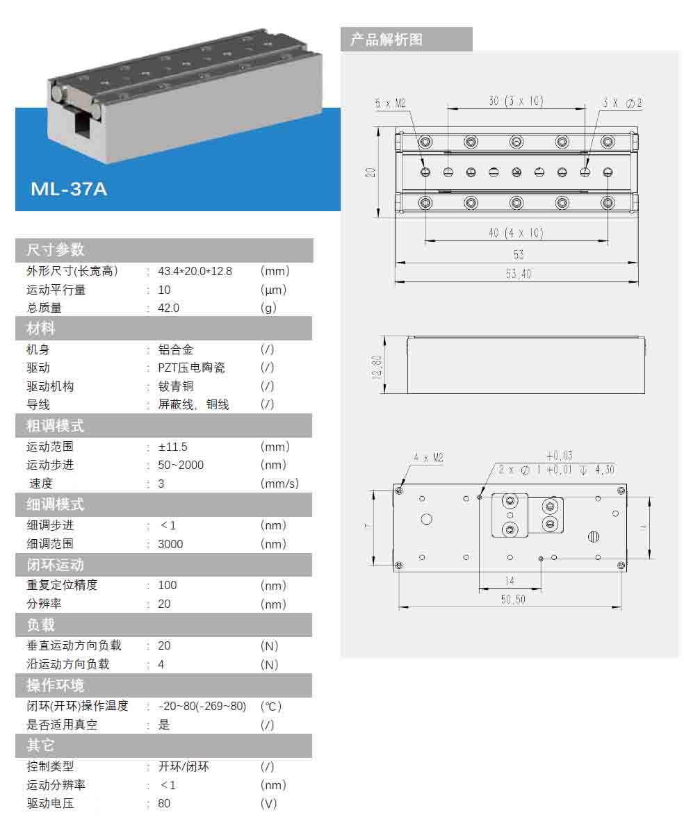 线性压电位移台-ML系列 ML-37A 垂直运动方向负载20N,沿运动方向负载4N。